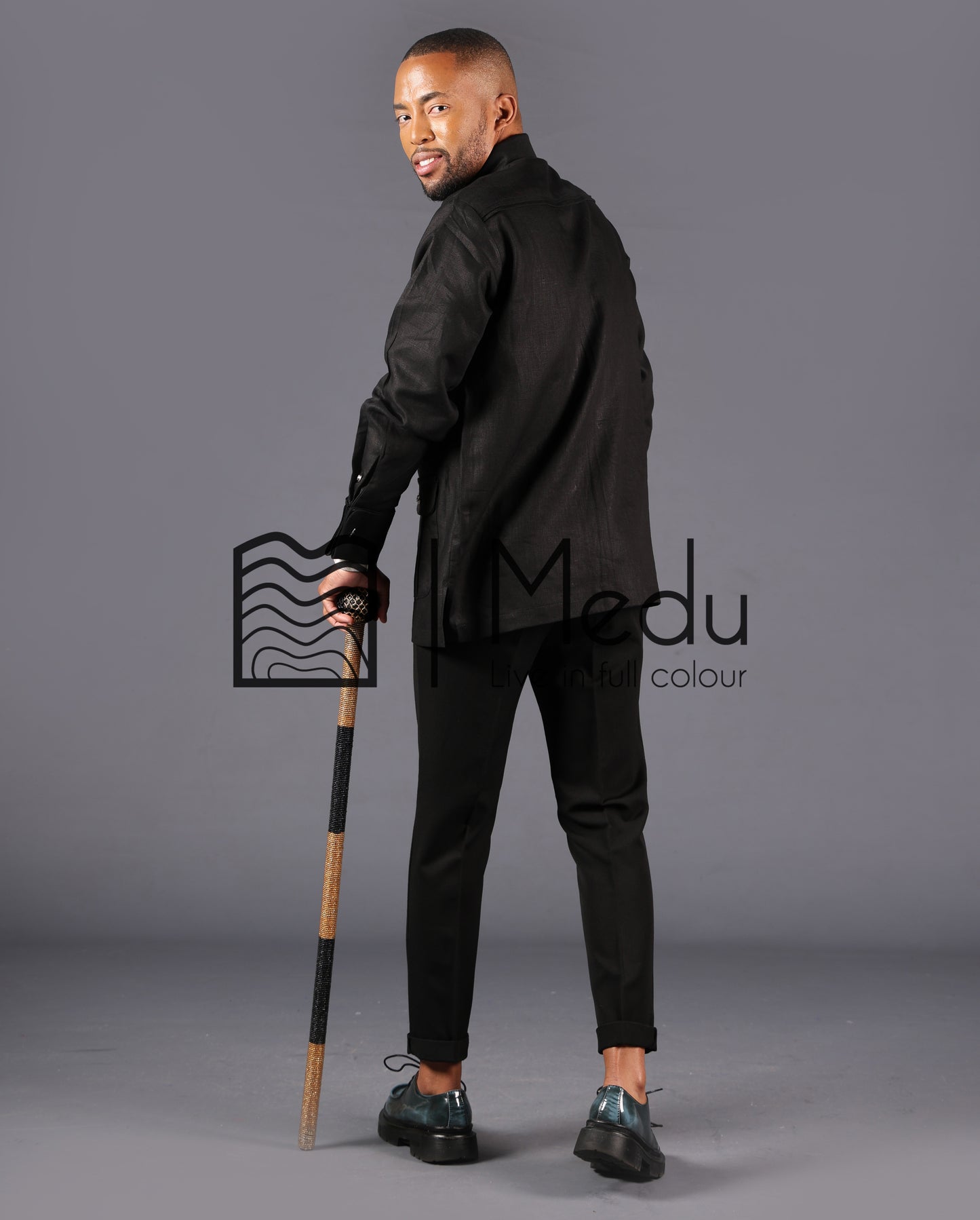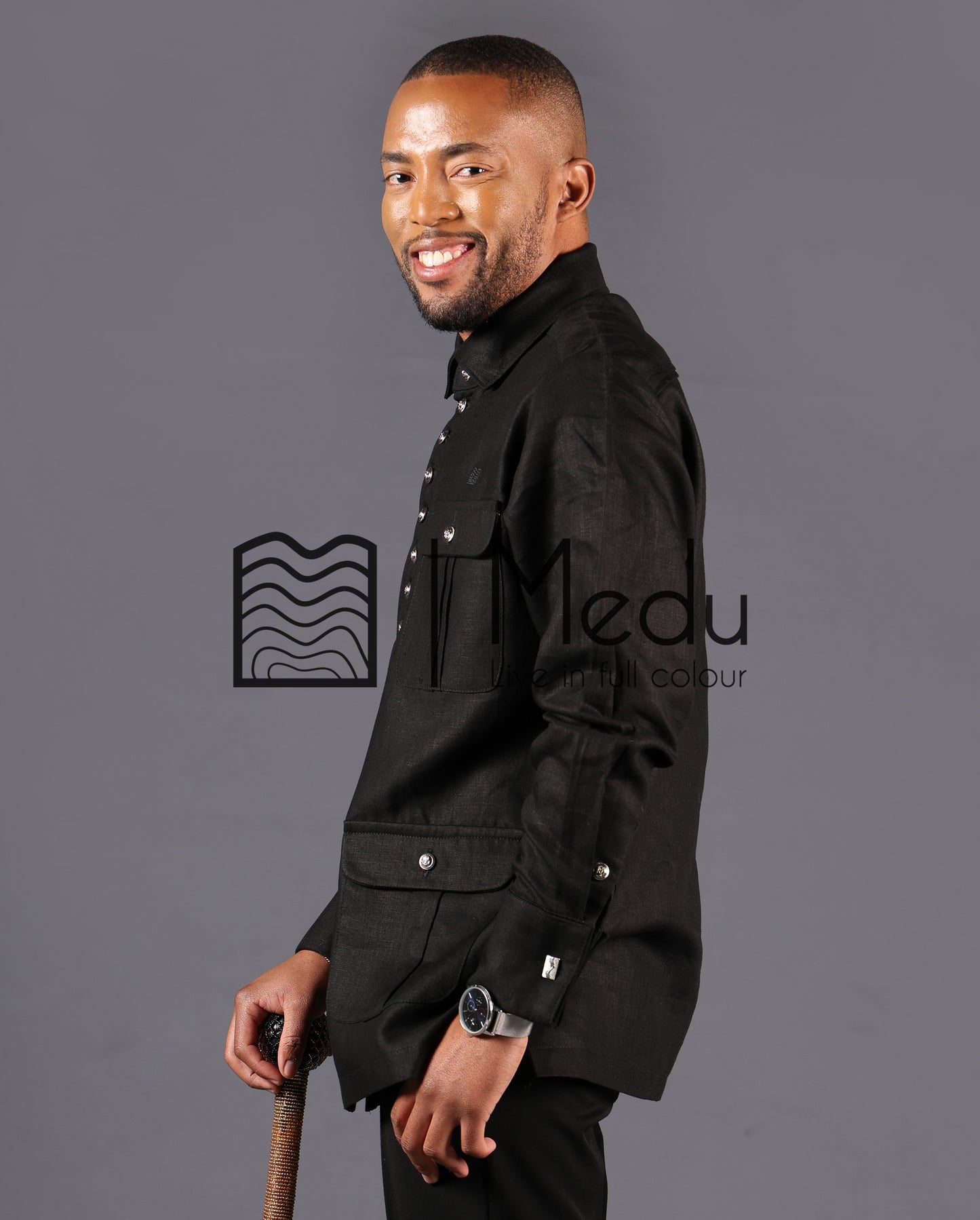 A refined fusion of classic safari silhouette and modern African elegance. Crafted from premium linen fabric for a structured yet comfortable fit, this shirt features distinct panel detailing and bold contrast silver accents. Ideal for a more formal style.