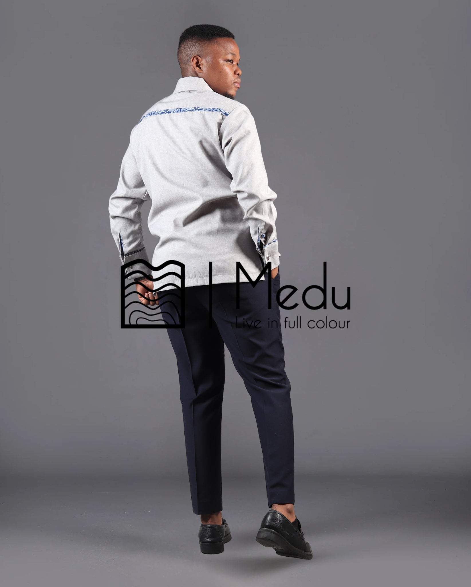 A refined fusion of classic safari silhouette and modern African elegance. Crafted from premium suiting fabric for an elegant yet comfortable fit, this shirt features distinct panel detailing and bold contrast blue accents. Ideal for a more formal style.