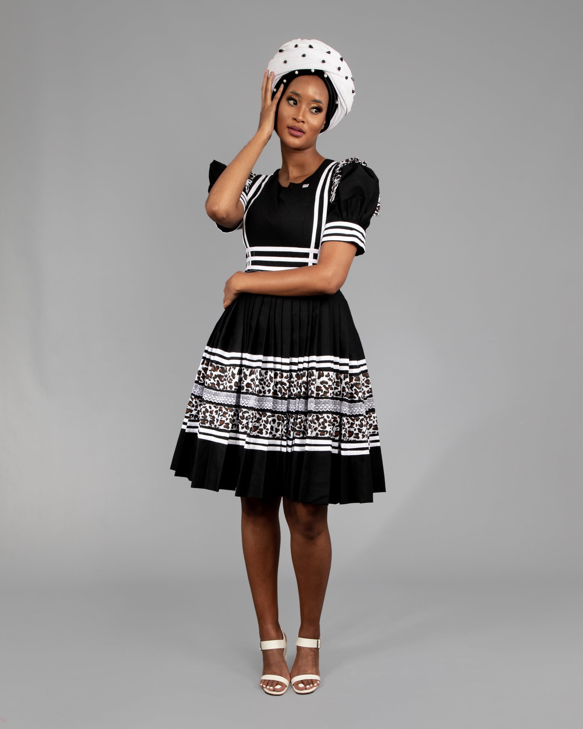The sleeves of the dress feature puff and cuff detailing, adding a touch of volume and femininity to the design. The intricate leopard print decorations on the dress pay homage to the regal significance of this print in South African culture, making this dress a beautiful celebration of tradition and history.
