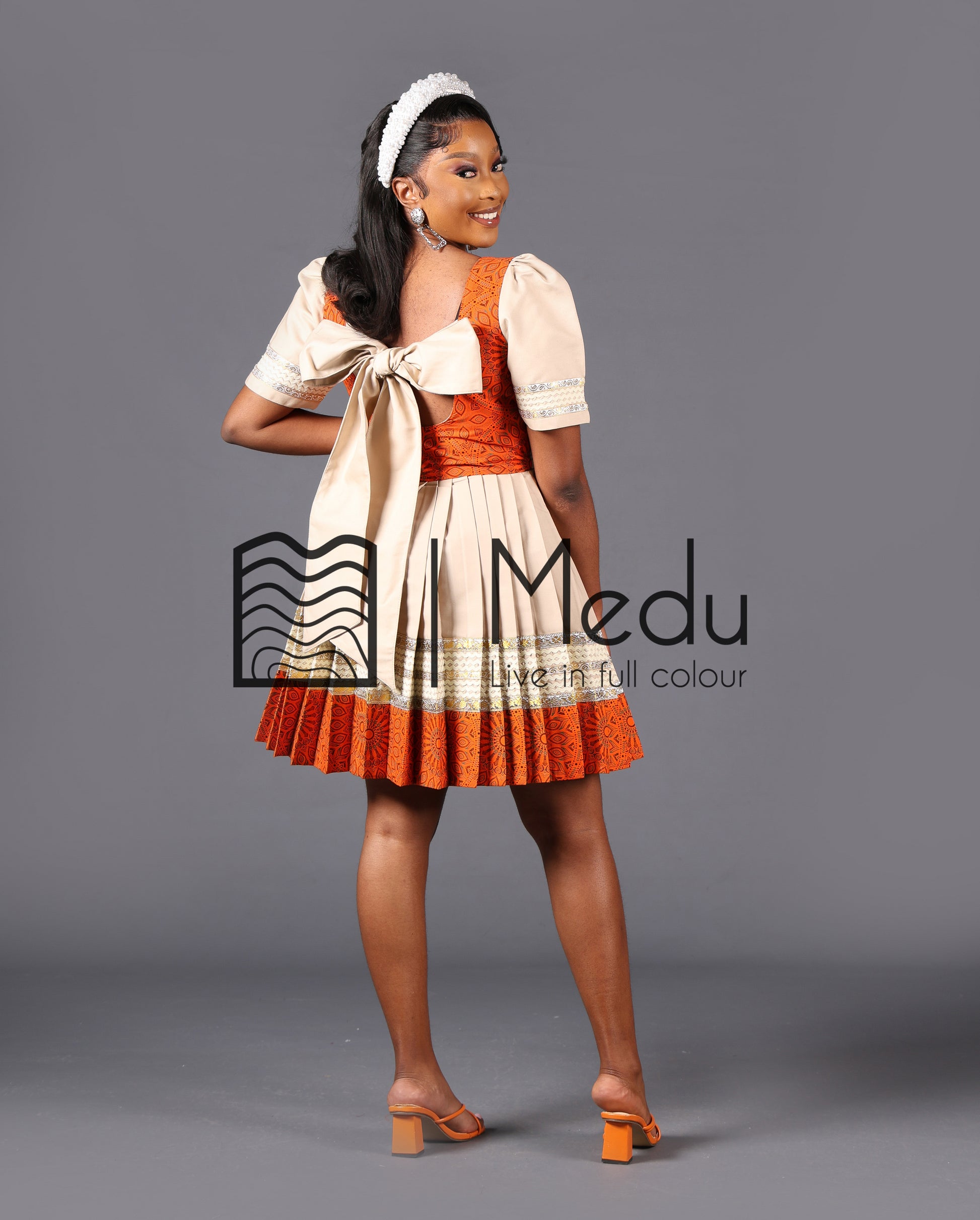 MMASHELA GIANT BOW MINI DRESS IN BEIGE AND ORANGE